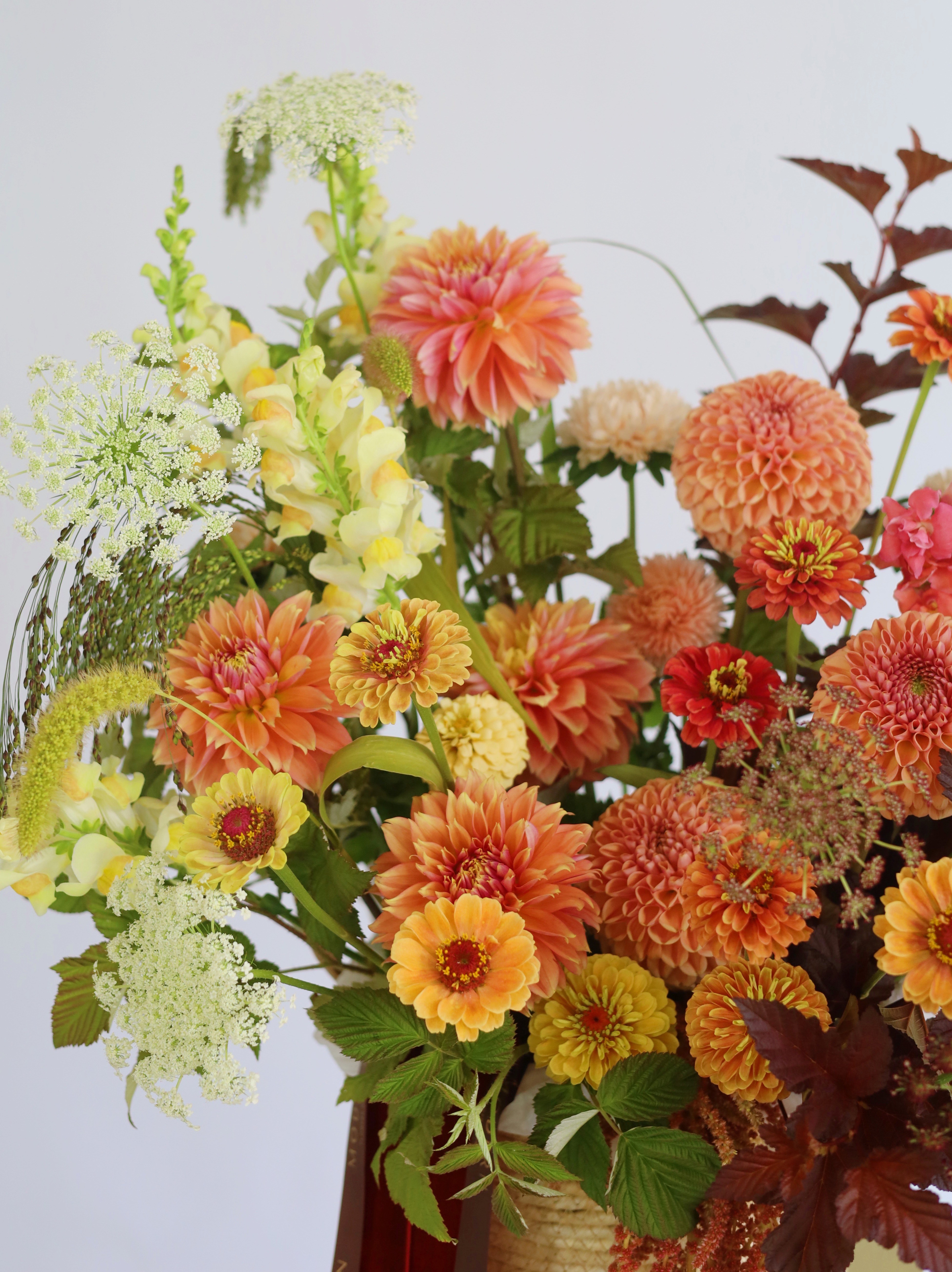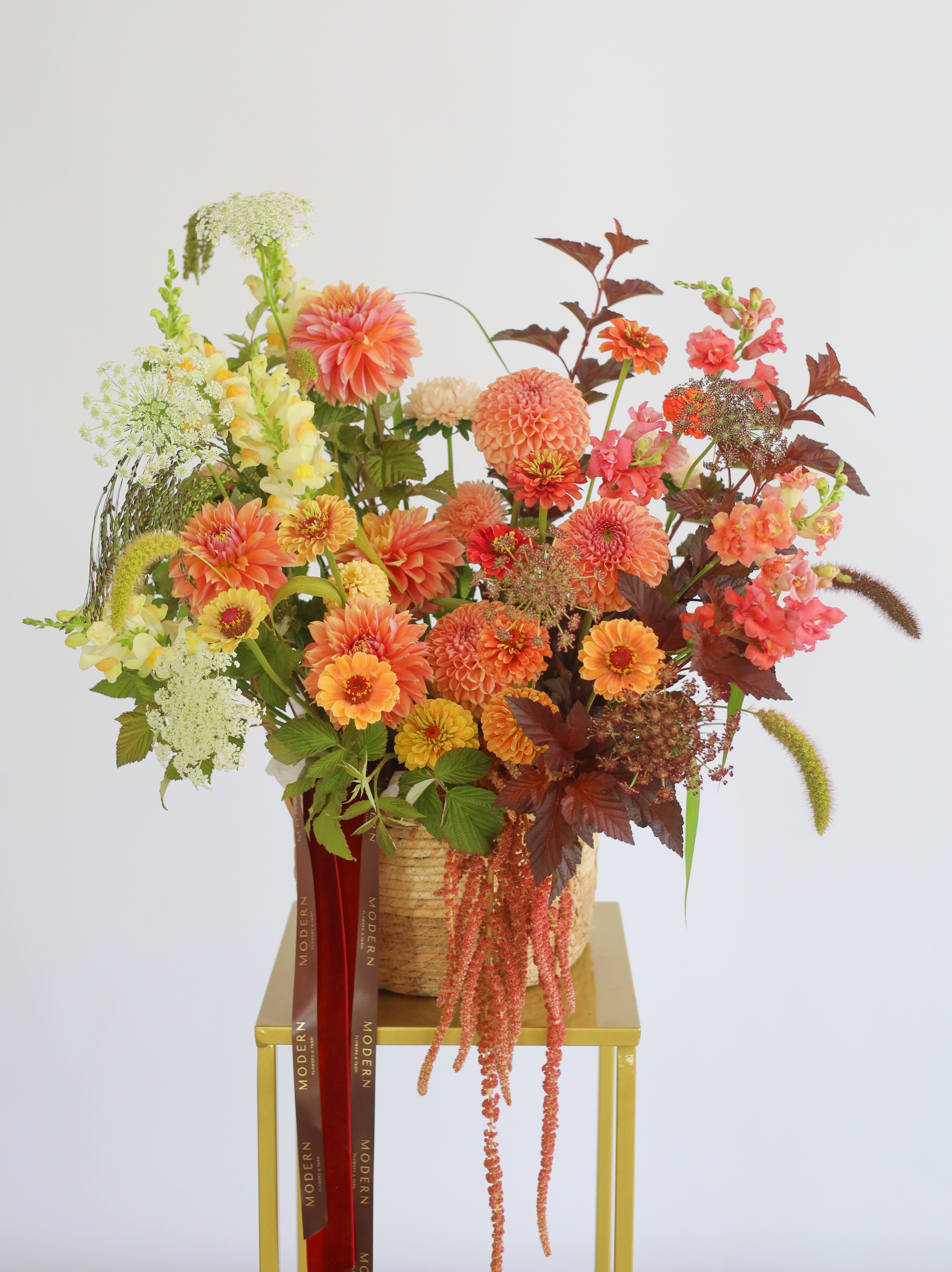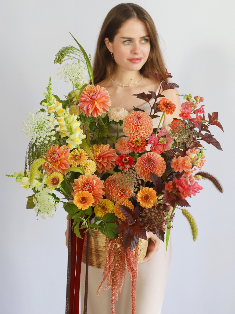 Очаровательная корзина с георгинами, амарантом и циннией