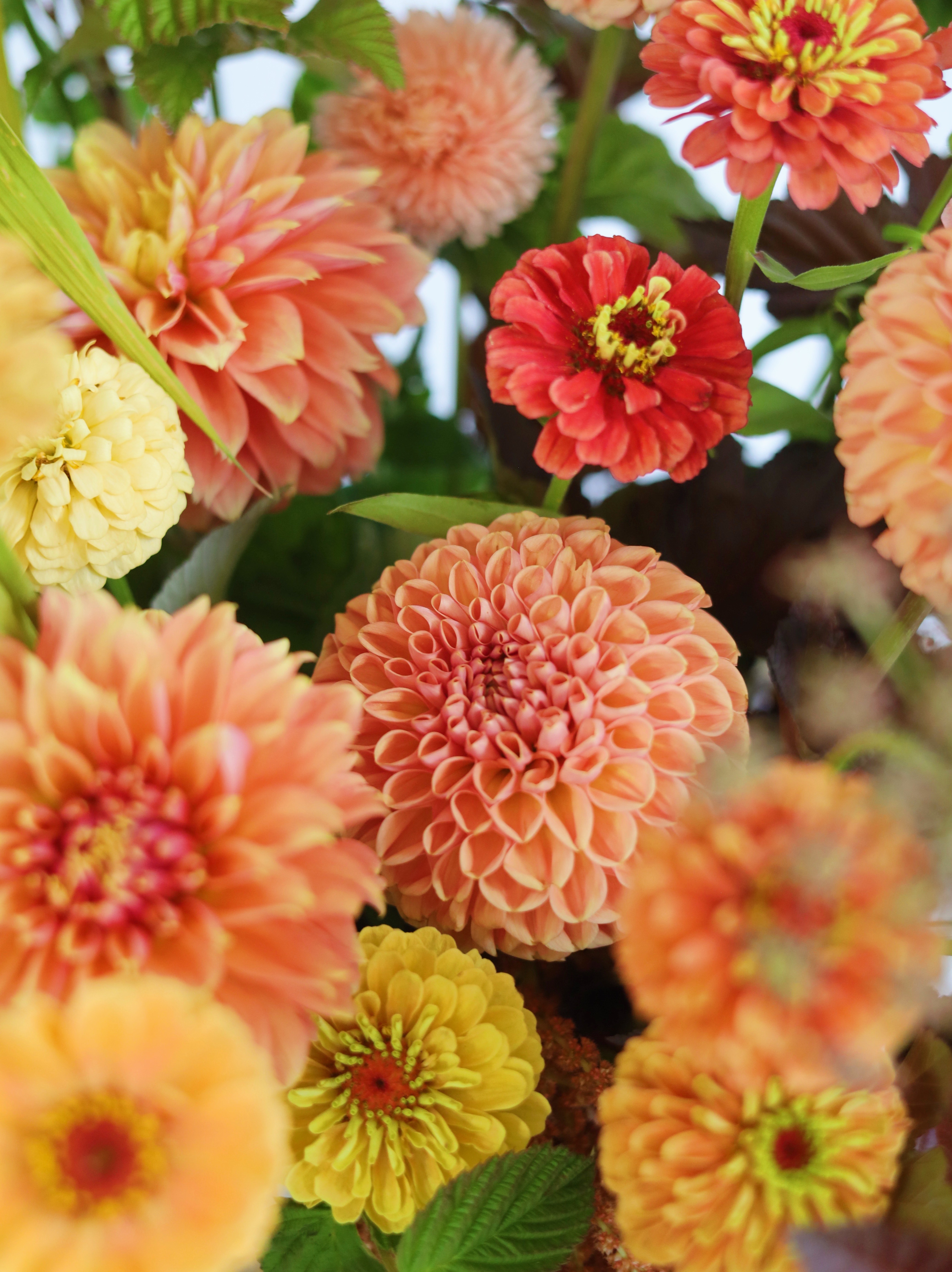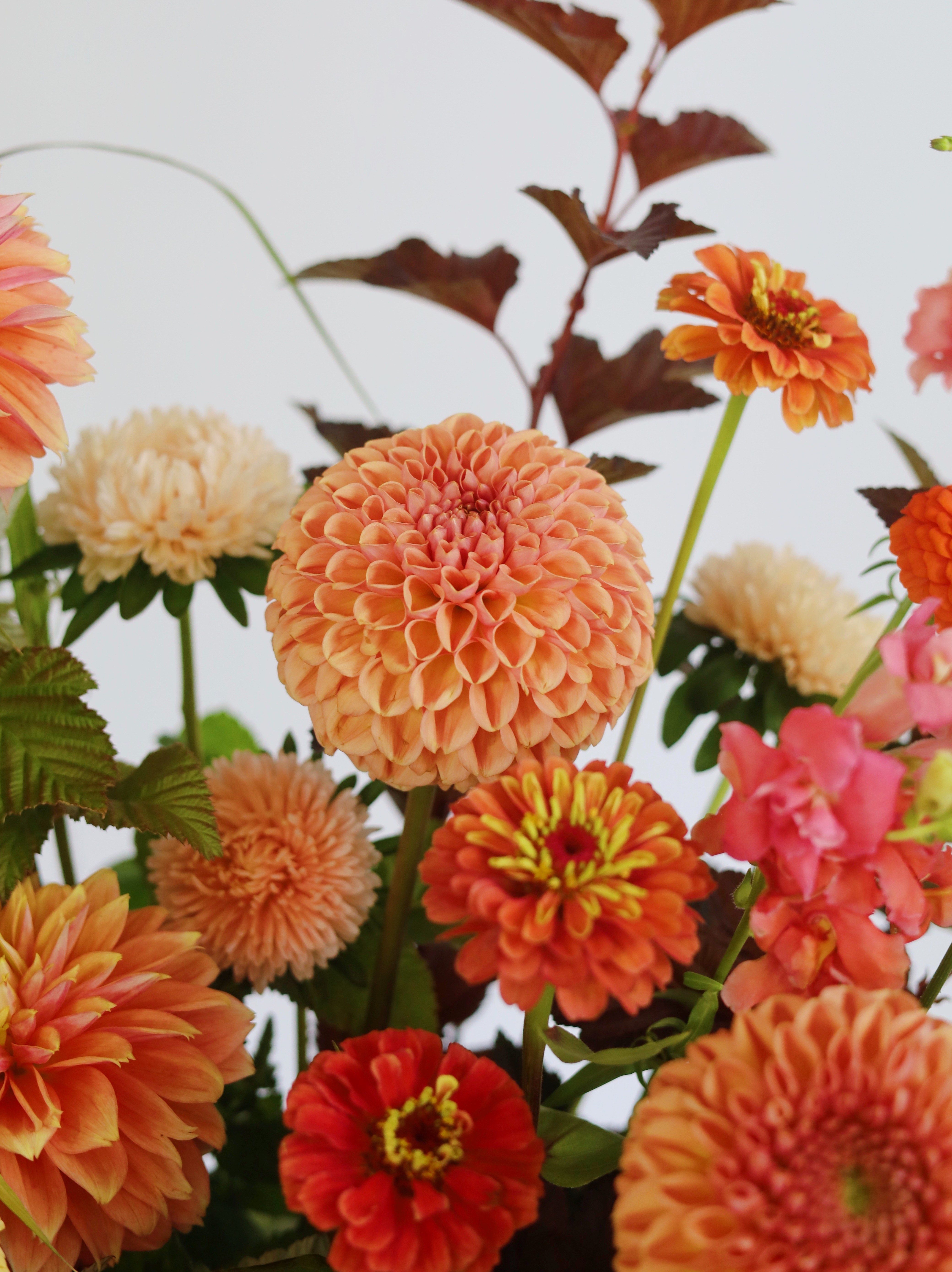 Цинния — яркий акцент композиции, привносящий в букет жизнерадостность и энергию своими насыщенными соцветиями.