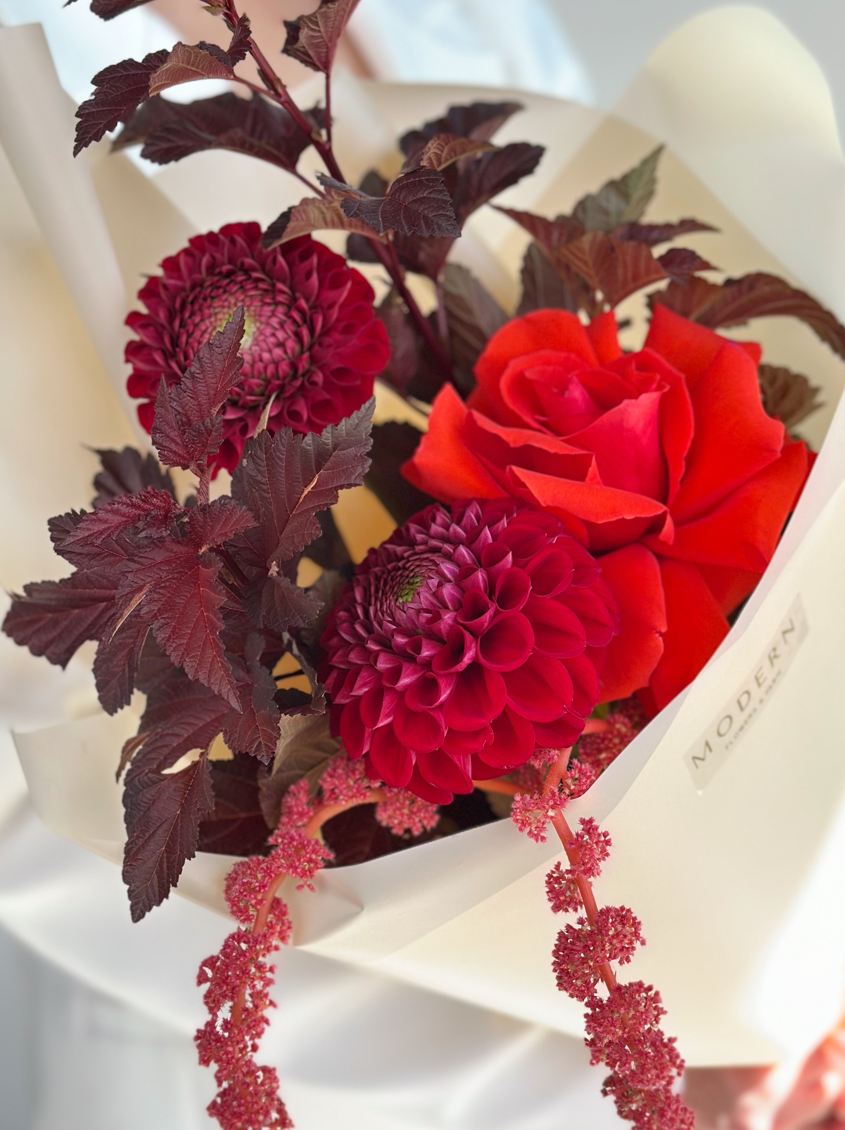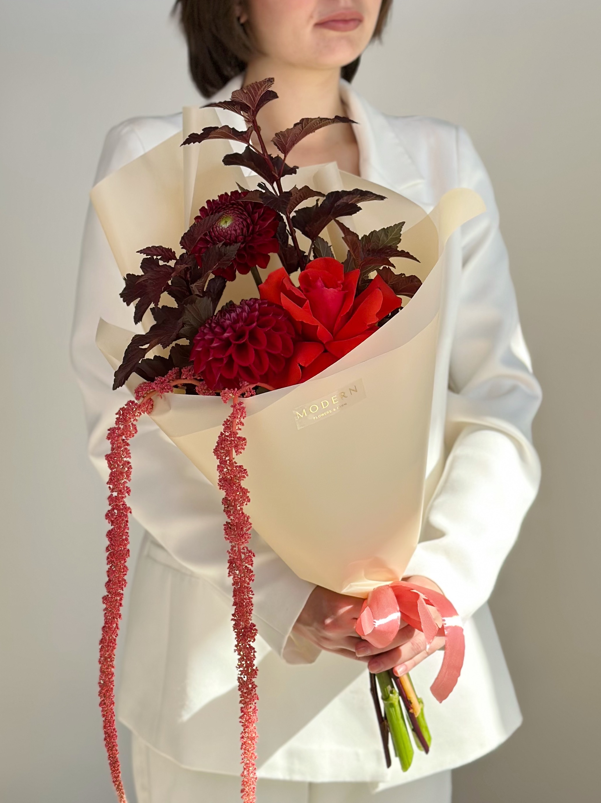 БУКЕТ С ГЕОРГИНАМИ, РОЗОЙ И АМАРАНТОМ
