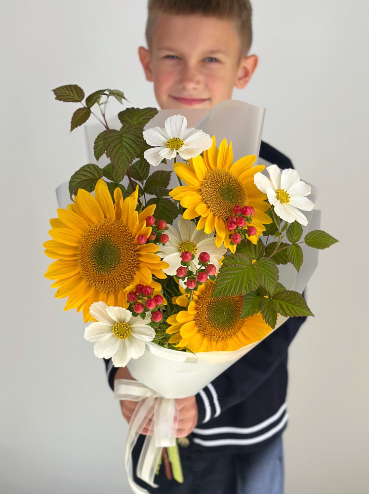 —БУКЕТ С ПОДСОЛНУХАМИ И КОСМЕЕЙ