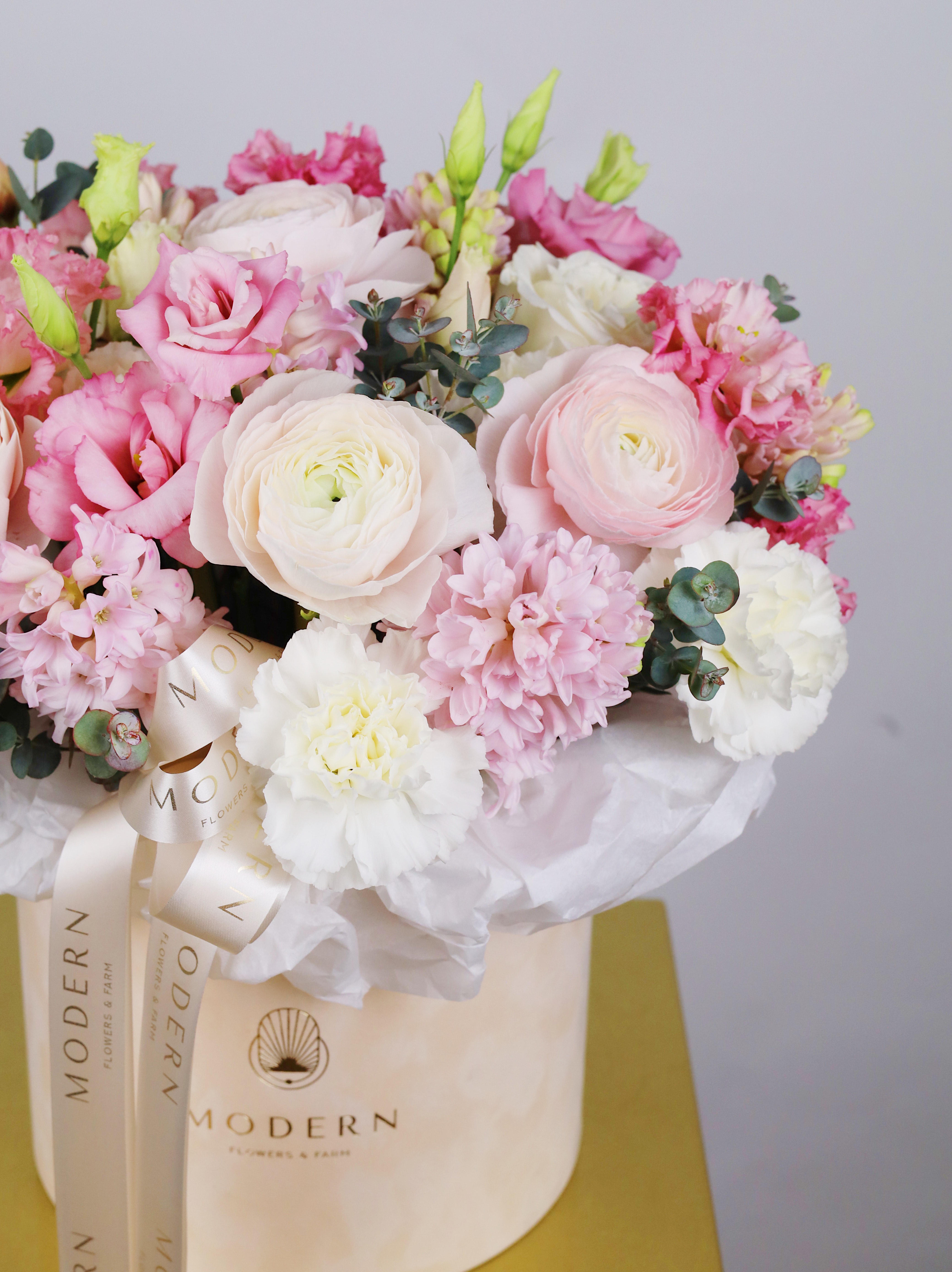 —БУКЕТ С РАНУНКУЛЮСАМИ, ГИАЦИНТОМ И ЛИЗИАНТУСОМ В БАРХАТНОЙ КОРОБКЕ