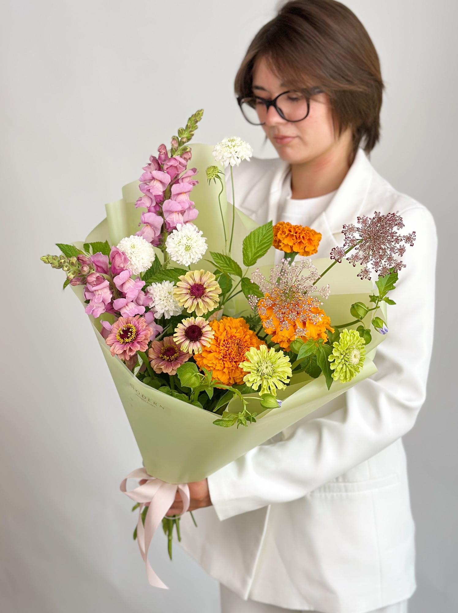 БУКЕТ С ЦИННИЕЙ И ДРУГИМИ ФЕРМЕРСКИМИ ЦВЕТАМИ