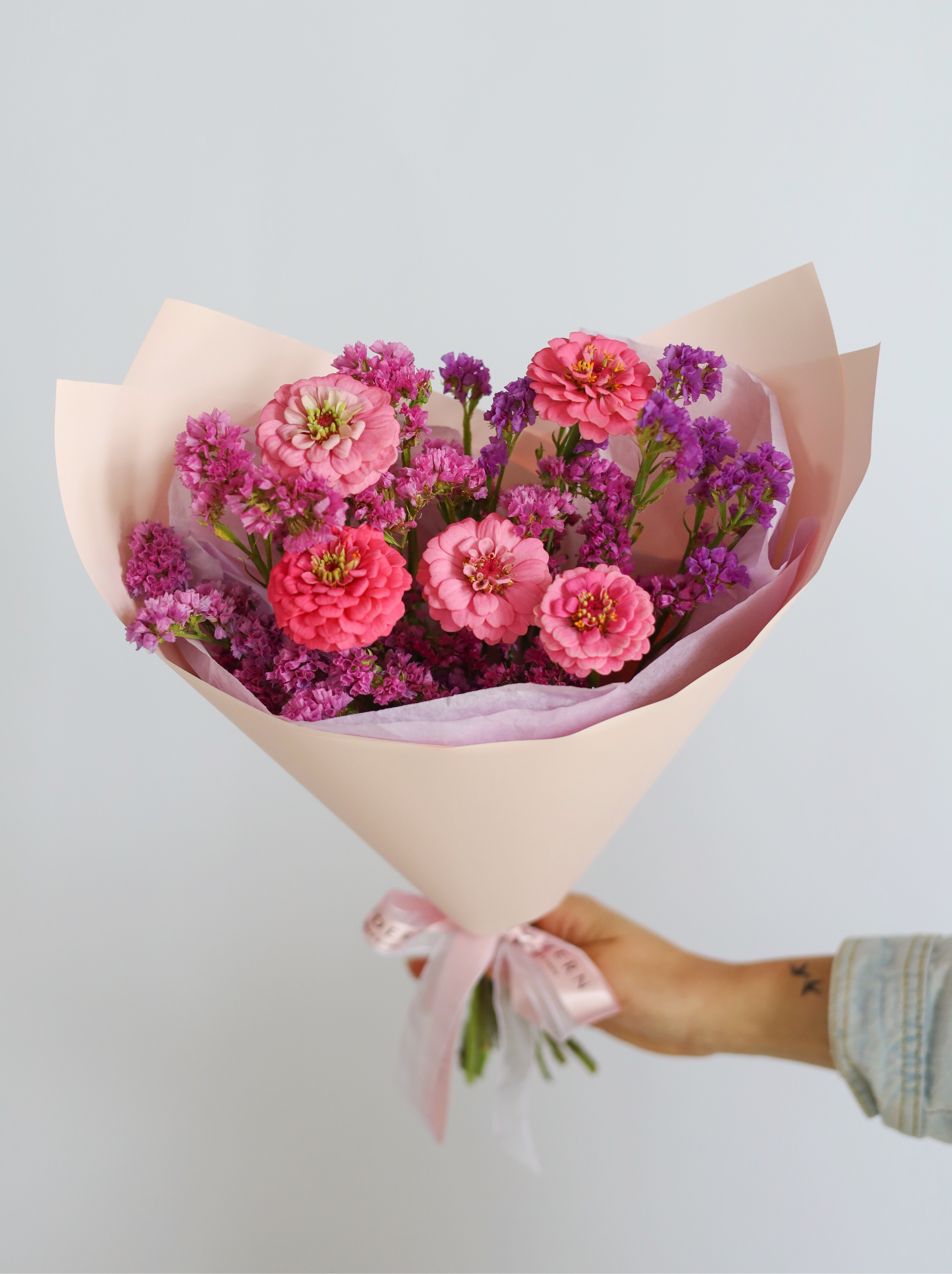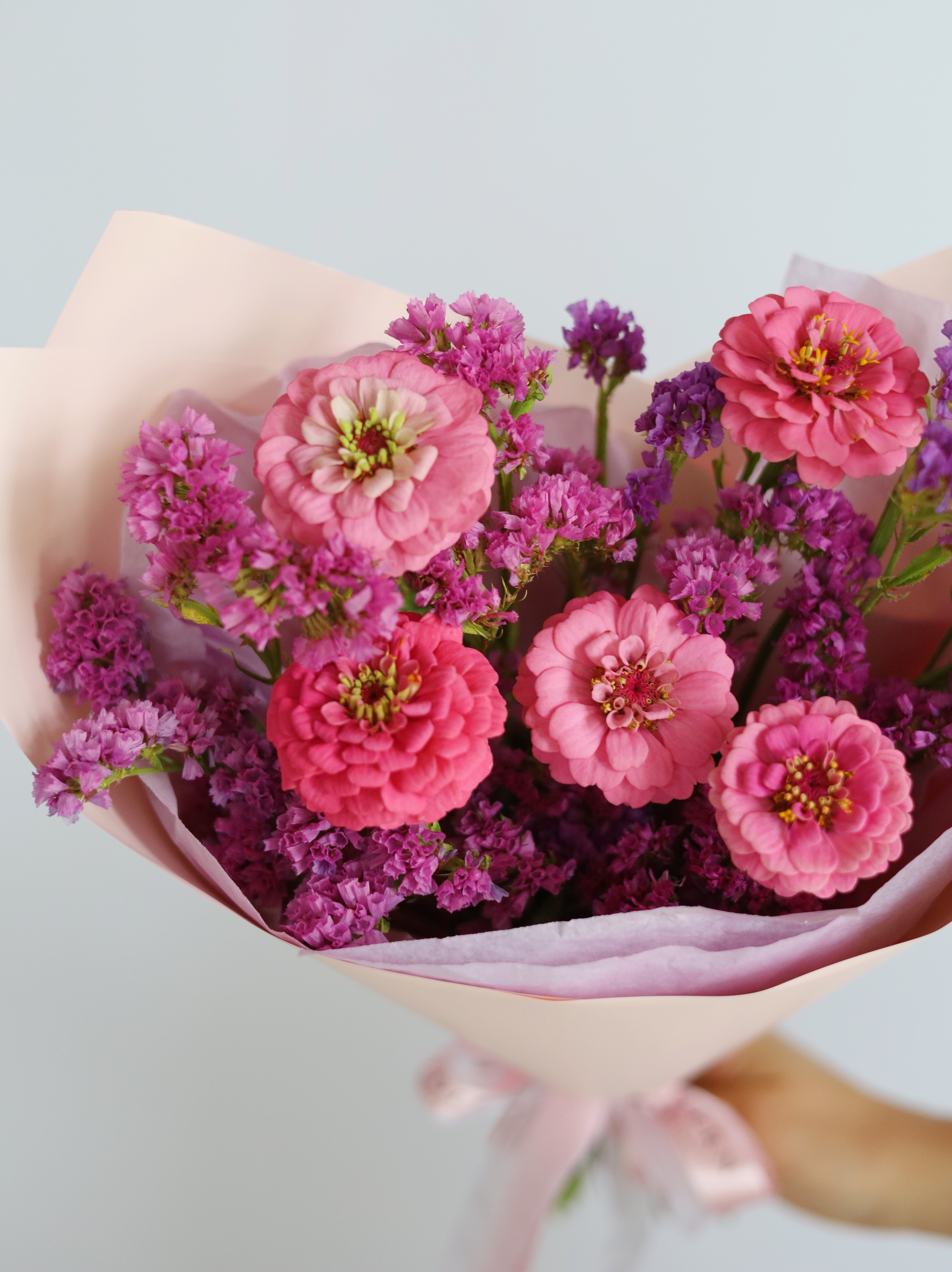 БУКЕТ С ЦИННИЕЙ И СТАТИЦЕЙ