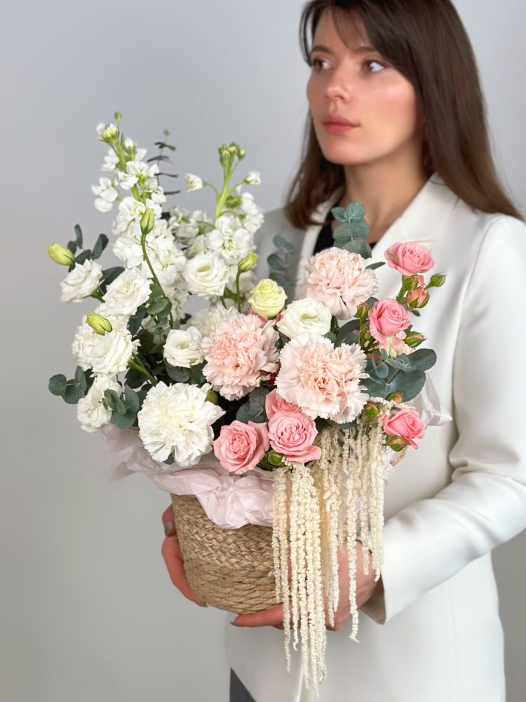 БЕЛОСНЕЖНАЯ КОРЗИНА С ЭУСТОМОЙ И ГВОЗДИКОЙ