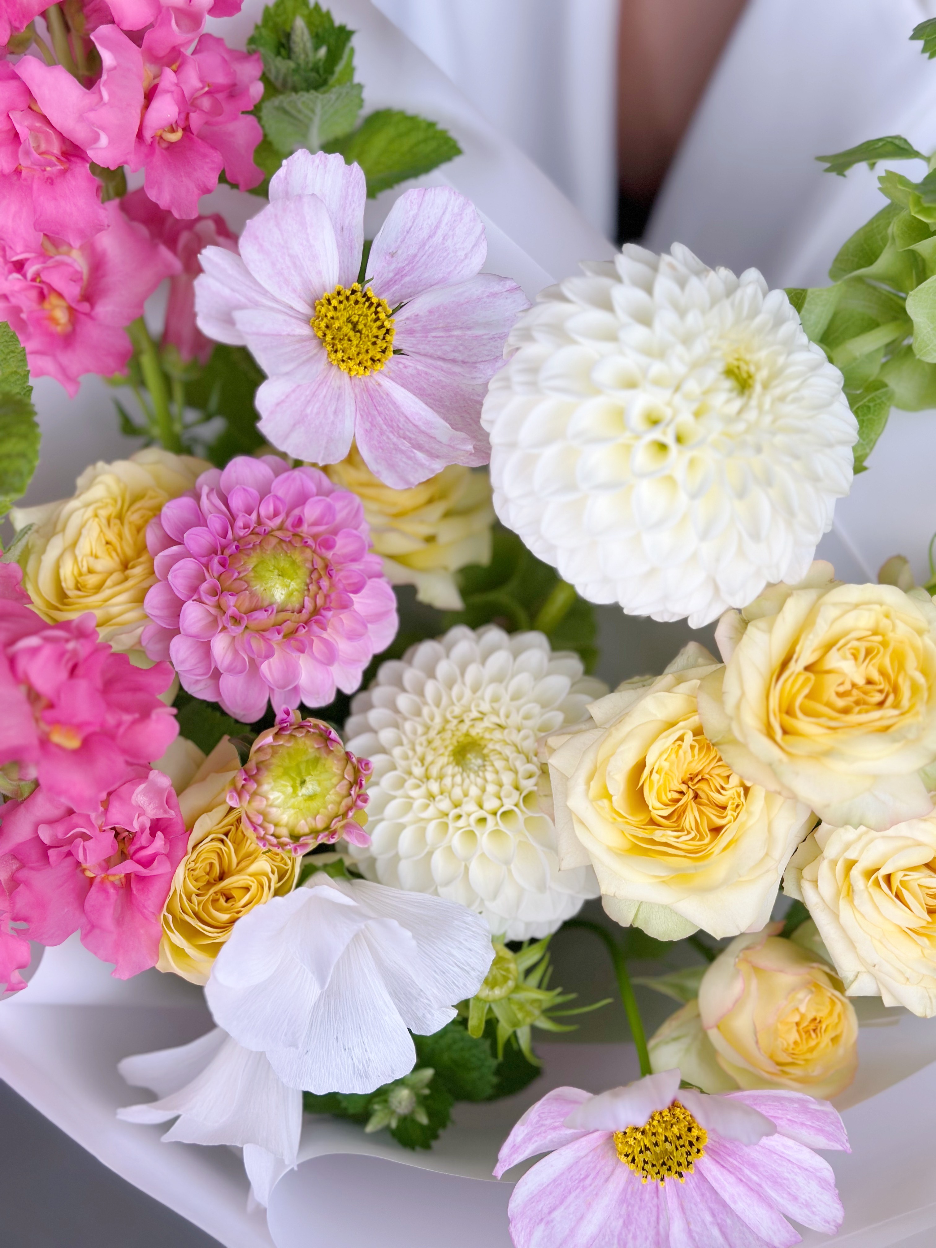 —НЕЖНЫЙ БУКЕТ С ГЕОРГИНОМ И ПИОНОВИДНОЙ РОЗОЙ