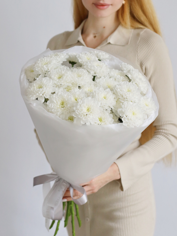 Купить букет белых хризантем можно на modernflowersfarm.ru, выбрав круглый классический, садовый или раскидистый подарок, оформленный в: