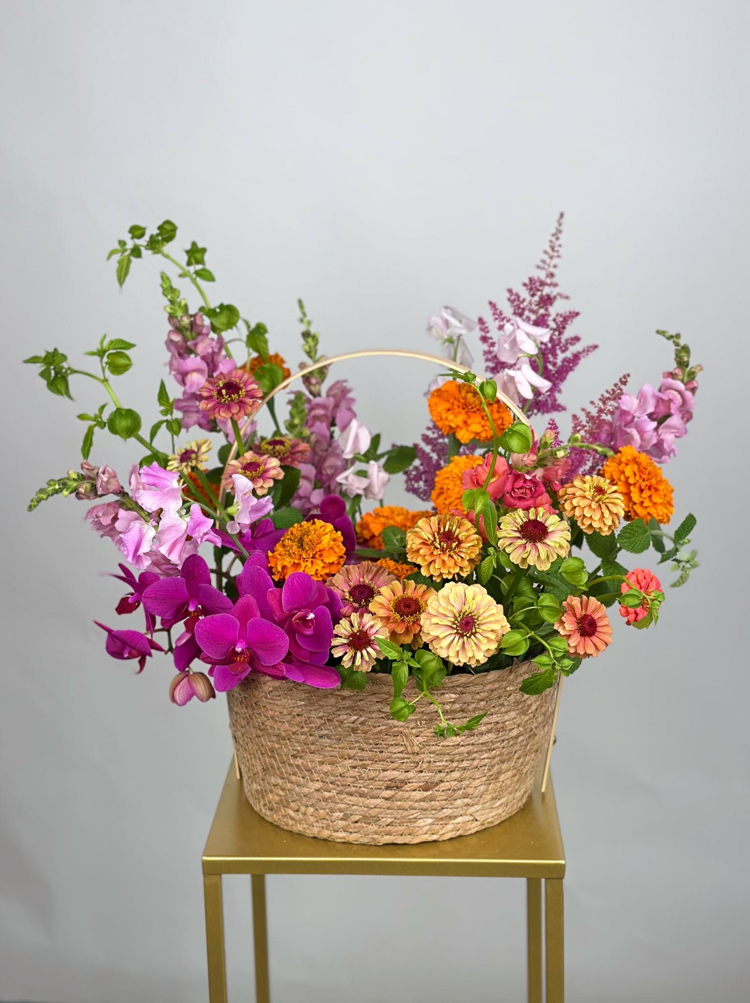 Представляем вашему вниманию утонченную цветочную композицию, где элегантность орхидей гармонично сочетается с очарованием сезонных летних цветов.