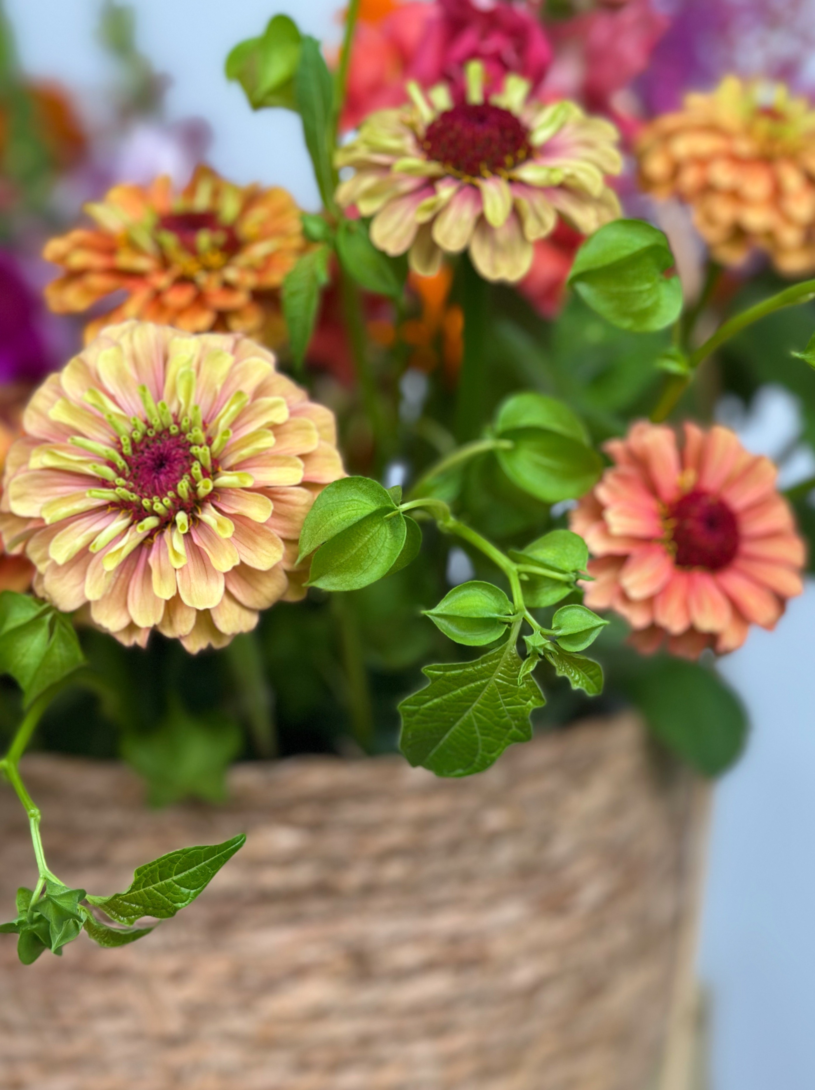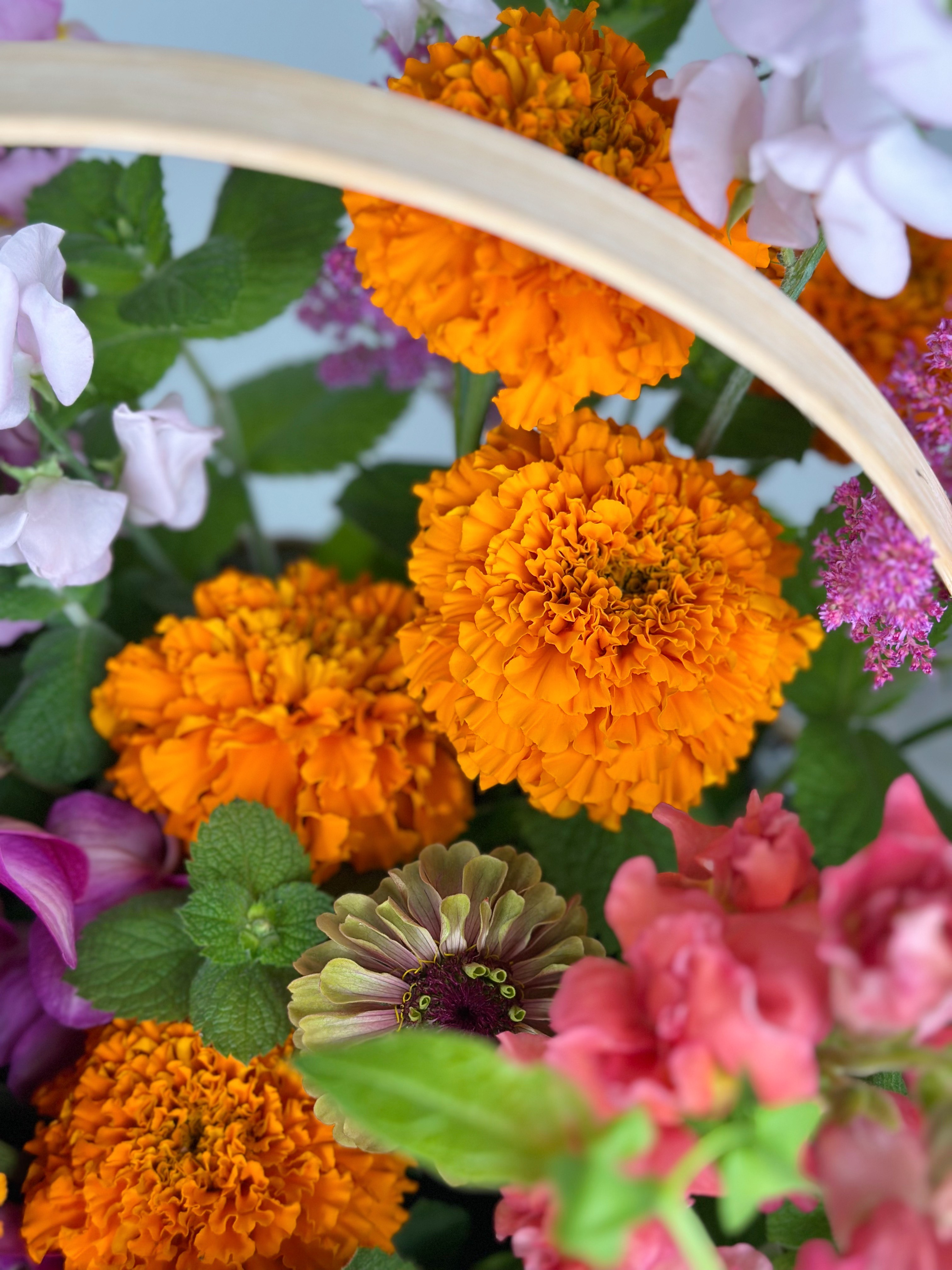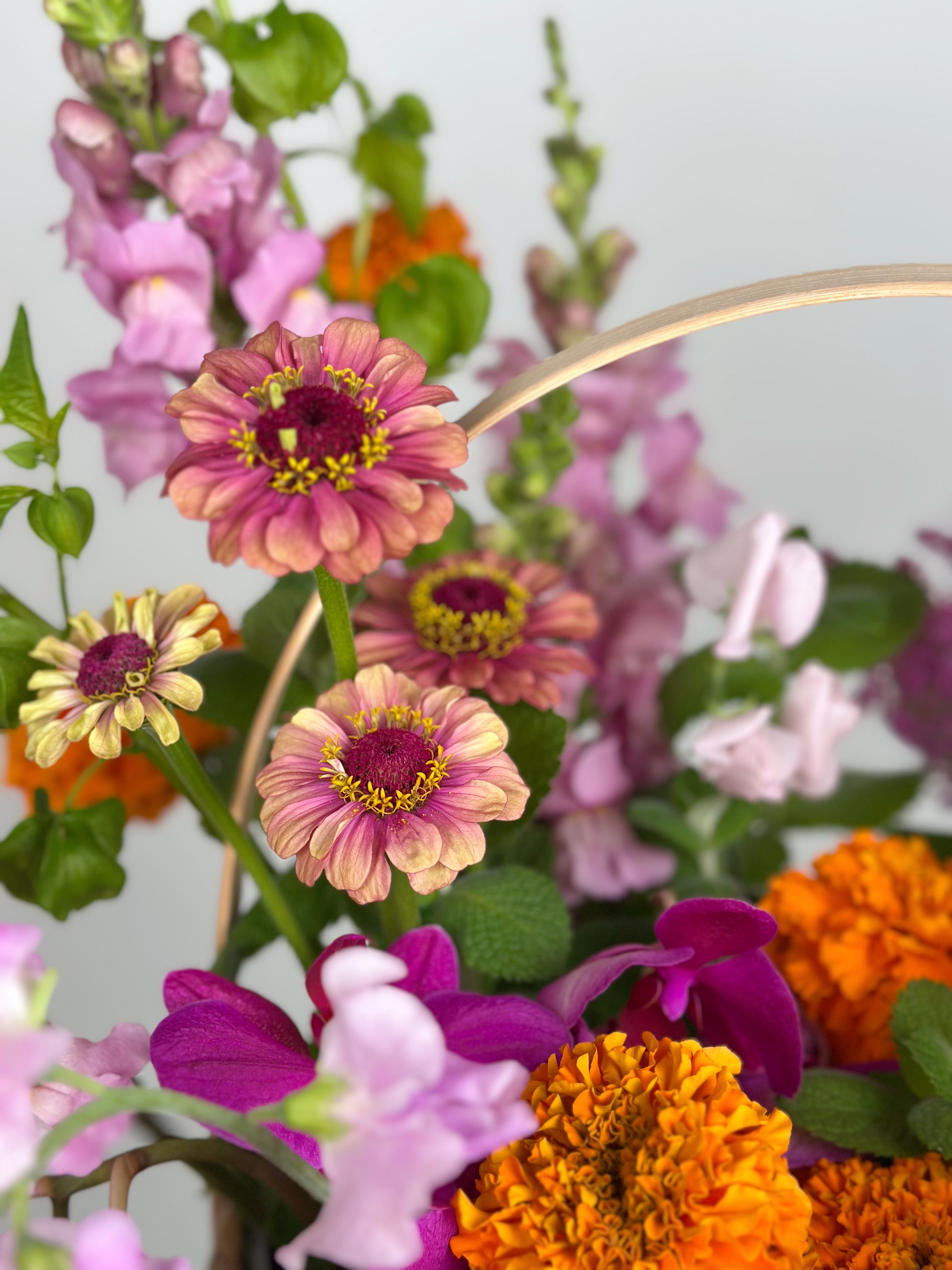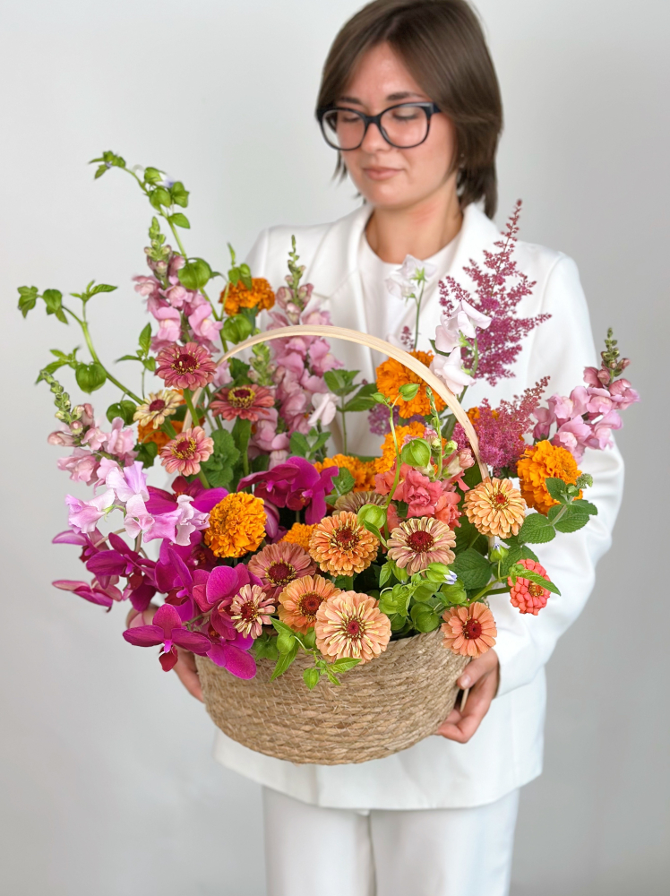 (!) В составе данного букета использованы сезонные летние цветы, мы соберем для вас похожий букет из имеющихся цветов в похожей стилистике и цветовой гамме.